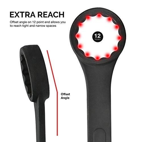 - Produt 2: [QUALITY]: Preision mahined wrenh features a 15-degree angled offset open end and 12-point hamfered box end to tighten and loosen, nuts, truk nuts, bolts, and pipes.