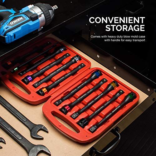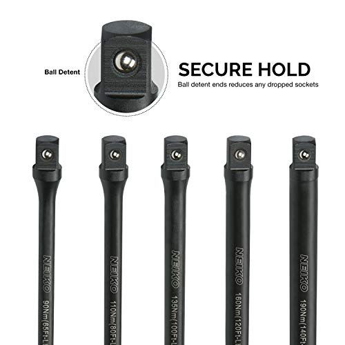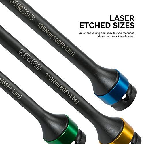 Details: The Neiko 02459A Torque Limiting Extension Bar 10-Piee Set omes with the following: 10 1/2-Inh Drive Impat Torque Limiting Extension Bars: Foot-Pounds ( Newton Meters)75 Ft-lb ( Nm) Ft-lb ( Nm) Ft-lb ( Nm) Ft-lb ( Nm) Ft-lb (135 Nm) Ft-lb (1 Nm)130 Ft-lb (175 Nm)140 Ft-lb (1 Nm)1 Ft-lb (200 Nm)Storage Case