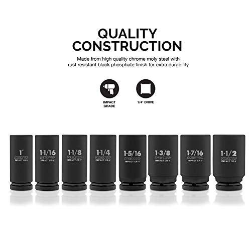 - HEAVY DUTY BUILD: The onstrution of eah 3/4 soket in 8 piee set onsists of extremely strong Chrome Vanadium (Cr-V) steel that will output greater torque, but also has a orrosion resistant blak phosphate finish to give your sets longevity and longer lifespan.