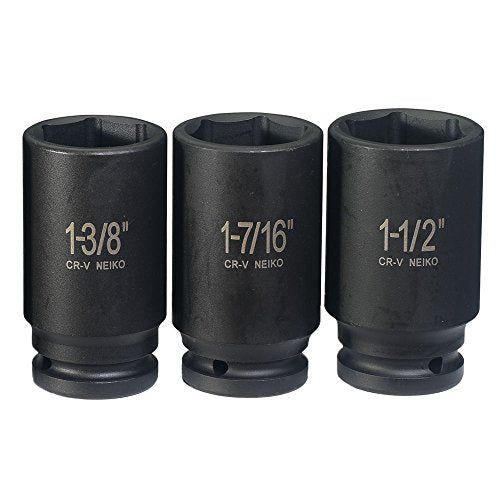 Details: From truks and trators to heavy equipment or large mahinery, big servie and repair jobs need the NEIKO 02461A 3/4-inh Drive Deep Impat Soket Set. Made for use with impat wrenhes, premium hrome vanadium sokets deliver superior performane with max torque output. Deep broah offers the length to reah over threaded shafts and into reesses. High-torque, 6-point design ontats and grips the stronger flat sides of the fastener head, not the weaker orners, to prevent stripping or round-off under extreme stress. Extra-large, high-ontrast size markings are permanently laser ethed onto eah soket, making size seletion quik and easy, even in low light settings. A durable blak phosphate finish protets from rust and orrosion. Lastly, the rugged blow-mold ase keeps everything organized for neat, effiient storage and makes for portability to arry to the job. This 8 piee set inludes: 3/4-inh drive impat sokets (SAE): 1, 1-1/16, 1-1/8, 1-1/4, 1-5/16, 1-3/8, 1-7/16, 1-1/2 inh.