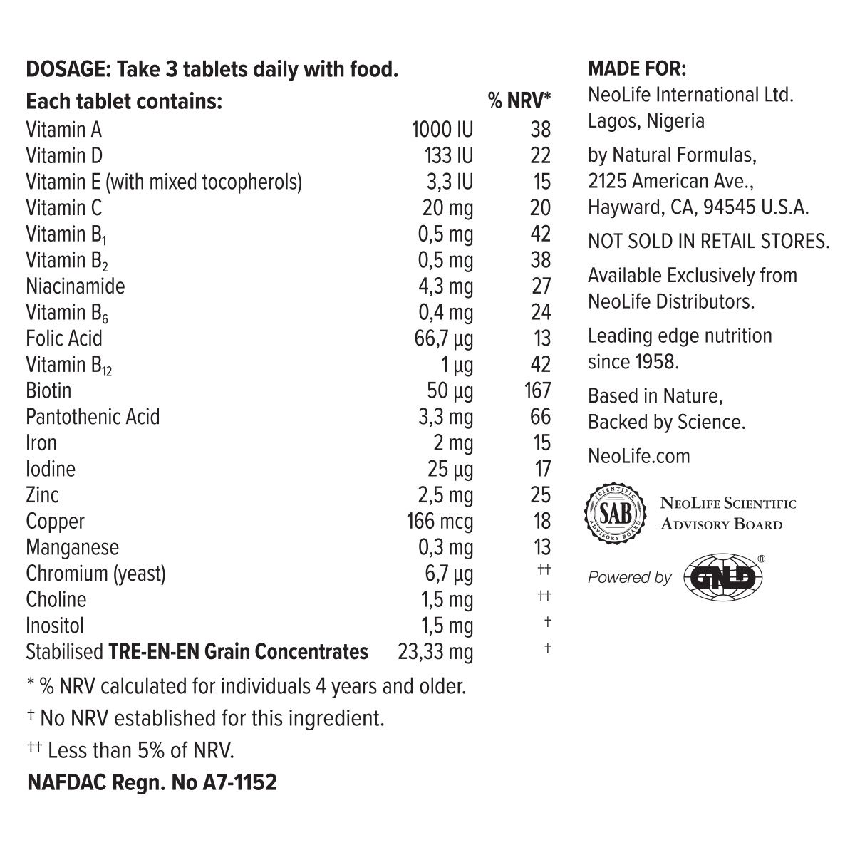 Usage:- Take 1-3 tablets daily at mealtimes as a nutritional supplement.