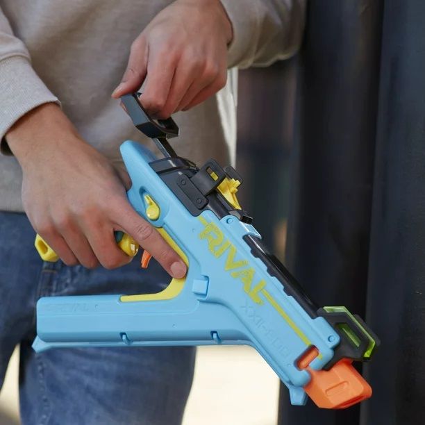 NERF RIVAL VISION XXII-800 BLASTER: With an 8-round integrated magazine, draw-back priming bar, and trigger lock. Fires rounds at a velocity of 90 feet per second