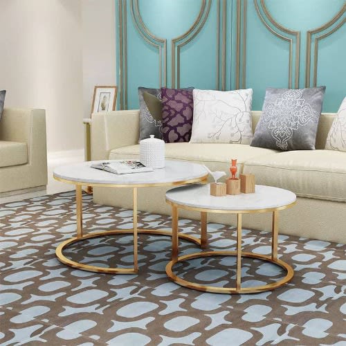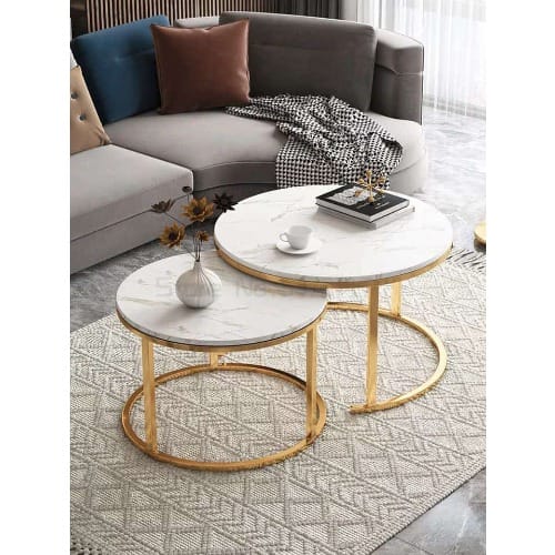 This faux effect coffee table for living room sofa side round coffee tea table 2 in 1 Combination furniture white This Stylish pair of two nesting tables boasts all natural Marble like tops with stunning powder coated edges and bases.
