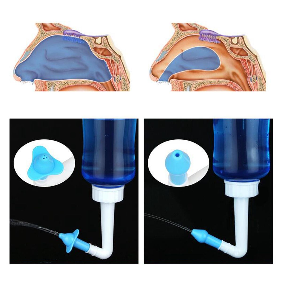 Nasal wash bottle is designed according to the internal physiological structure of human nasal cavity, Irrigating nasal passages and sinuses rinses out mucus and various irritants.For Allergies & Cold:clean your nasal mucous. If you have a pollen allergy and flush out any impurities, pollen or other irritants from your sinuses.Easy to Use: Unique construction and the patented button allow a perfect water flow, transparent, so it is easy to see the water level, easy for both adults and children to use.Breathe Better: Sinus rinses give users relief from various nasal symptoms, such as a runny nose or a post-nasal drip. It is suitable for those suffering from allergies and other sinus problems.Adult nozzle & child nozzle(optional) : Nozzle with wide caliber to make it suitable for adult's wash, Nozzle with 4 holes to make the flow more slow to adapte child's needs. Attention: child under 8 years old is not suitable to use this sinus rinse bottle.
