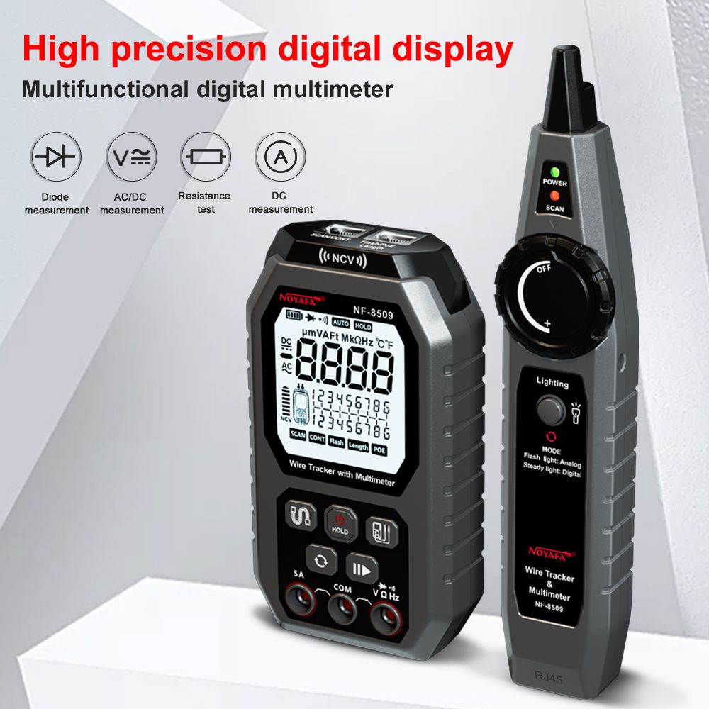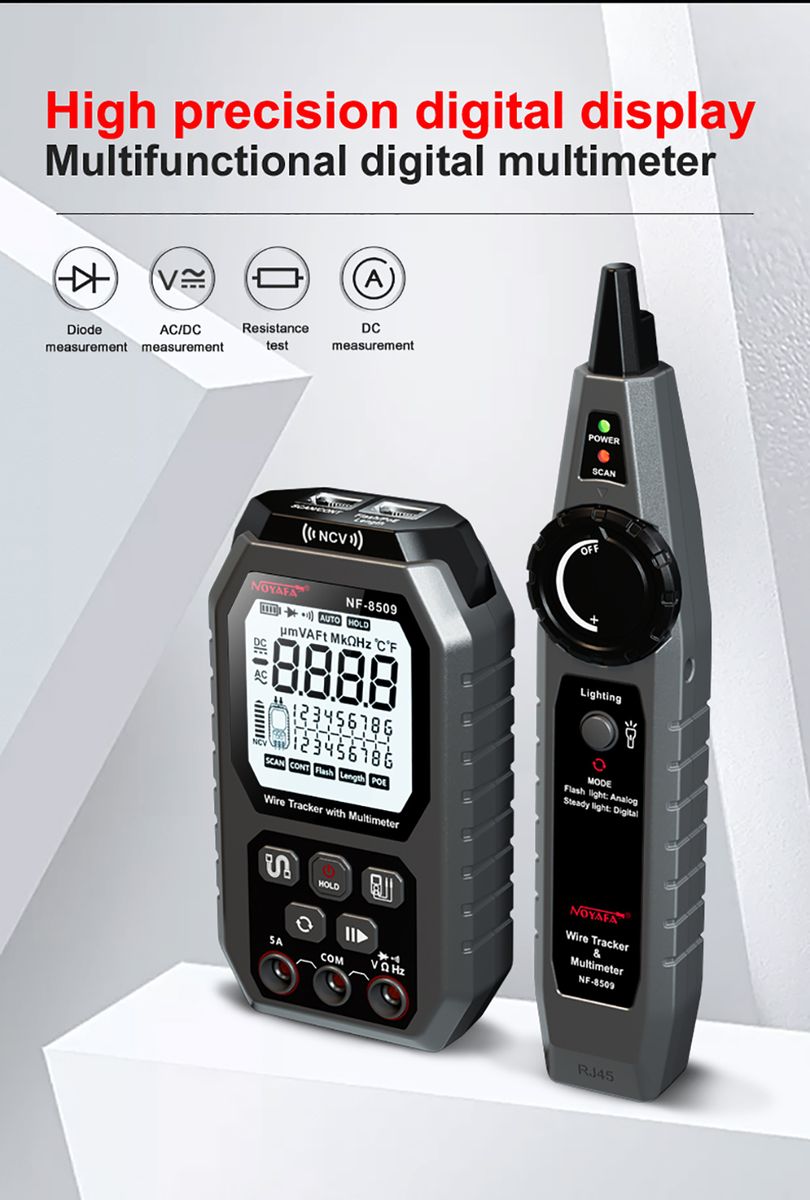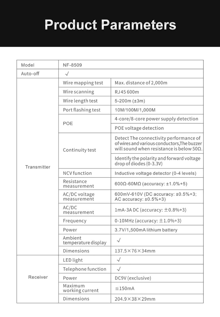 1 x Transmitter,1 x Receiver,2 x Test Meter Pen,1 x Type-C Data Cable,1 x Headset,1 x Tool Bag,1 x RJ45 Adaptor Cable,1 x User Manual (English/German/Spanish/French),