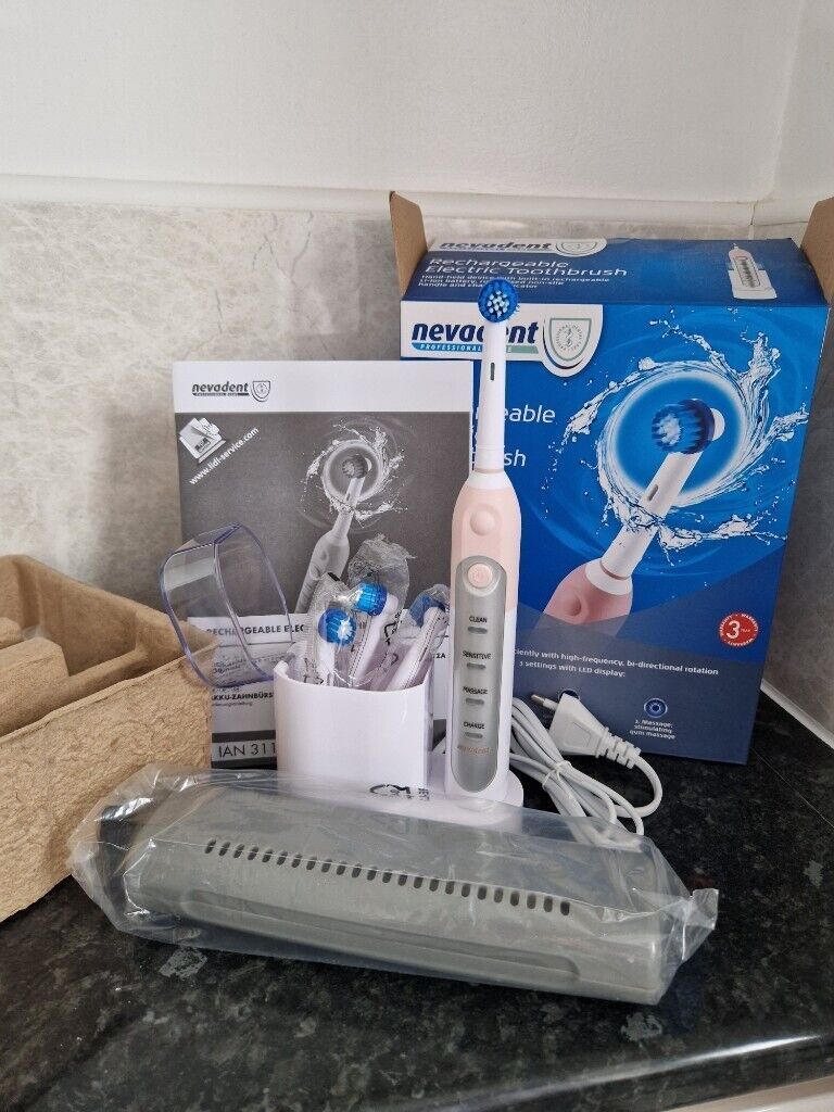 BRAND NEW, UNOPENED BOX , NEVADENT Advance Electric Toothbrush With practical Travel Case. 3.7 Li-Ion Rechargeable Battery . Pressure Sensor. Light up Red When You Apply To Much Sen Pressure. 2 Min Timer With 30 -Sec Intervals For Cleaning The Jaw Quadrant Evenly . Included 2 Colour - Coded Brush Heads With High -Quality Rounded DuPont. They change colour when needs to be replaced. Running Time Fully Charged :)90 Min COMPATIBLE With Nevadent Brush Heads . It has high speed oscillating system to thoroughly remove plaque