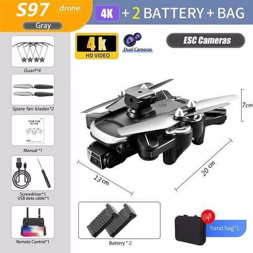 Product Name: S97 Optical Current Adjustable Camera Folding DroneModel: S97Color: Black/OrangeBasic functions: optical flow fixed height, electric adjustment of camera angle, obstacle avoidance on all sides, aircraft foldable, six-way with gyroscope; one-key take-off, one-key landing, ascending and descending, forward and backward, left and right side flight, steering, headless mode , body light/head light (with camera can add functions: gesture photo, video, headless mode, emergency stop, trajectory flight, gravity sensor, music, 50 times zoom, automatic photo)