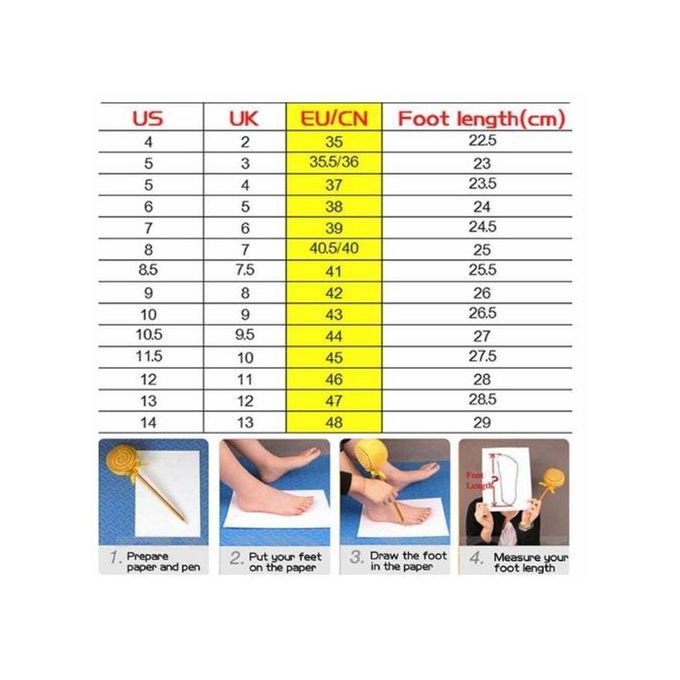 Welcome to our shopFor more fashion shoes, pls check our store Ready Stock-------------------------------------------------------------------------------------------------------- Size Fit: StandardSIZE CHART Size EU35 = Feet Length 22.5cm Size EU36 = Feet Length 23.0cm Size EU37 = Feet Length 23.5cm Size EU38 = Feet Length 24.0cm Size EU39 = Feet Length 24.5cm Size EU40 = Feet Length 25.0cm Size EU41 = Feet Length 25.5cm Size EU42 = Feet Length 26.0cm Size EU43 = Feet Length 26.5cm Size EU44 = Feet Length 27.0cm Size EU45 = Feet Length 27.5cm Size EU46 = Feet Length 28.0cm Size EU47 = Feet Length 28.5cm--- If your feet are wide or thick, pls choose one size bigger !!!--------------------------------------------------------------------------------------------------------NOTE:1. Due to the light and screen difference, the item color may be slightly different from the pictures.2.Please allow 0.5 cm error due to manual measurement.3. Due to the expensive international deliver charge,we are sorry that the product will be delivered without box.--------------------------------------------------------------------------------------------------------【