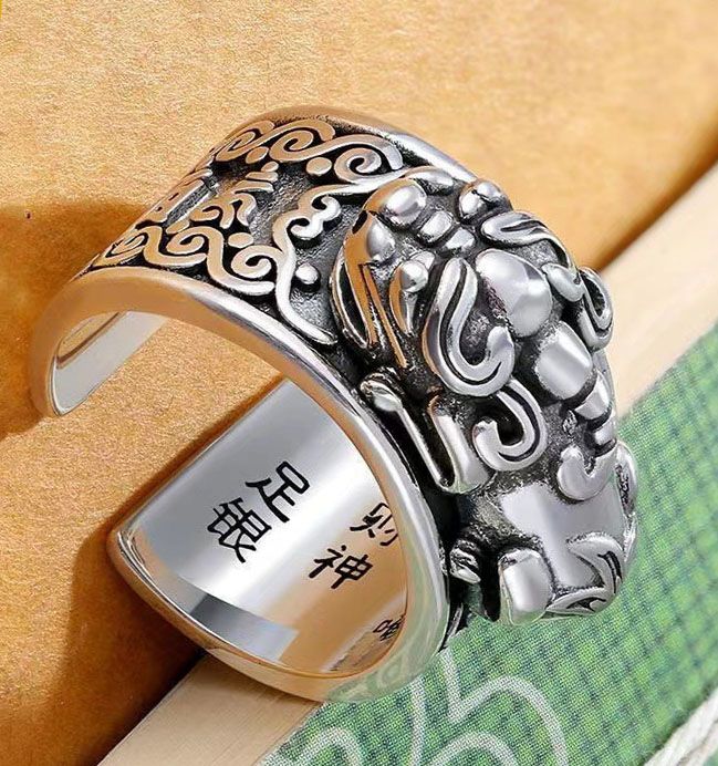 Type: RingTheme: Feng ShuiSize: width 0.85cm, thickness 0.12cm; Type: Pixiu ring; Adjustment: 18~33.Material: 990 Silver+Copper , Vintage Handmade, Well Polished Finish,It will Never Get Fade/Tarnished, Authentic, High Quality Guaranteed