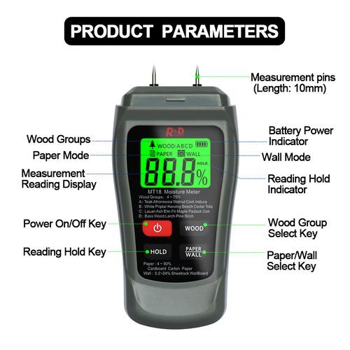 The instrument has for ABCD wood scales, enabling the user to take accurate moisture measurements in all kinds of wood species. You can choose paper mode to Test moisture of Cardboard, carton and paper. And you can select WALL mode to test moisture of sheetrock, wallboard, or other building materials.