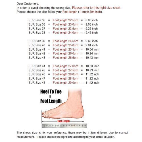 Men's Size Chart(Unit:cm/inch) US:7 UK:6.5 EU:39 CN:40 Foot Length:246-250mm/9.69"-9.84" Foot wide:10cm/3.94" US:7.5 UK:7 EU:40 CN:41 Foot Length:251-255mm/9.88"-10.04" Foot wide:10-10.5cm/3.94"-4.13" US:8 UK:7.5 EU:41 CN:42 Foot Length:256-260mm/10.08"-10.24" Foot wide:10.5cm/4.13" US:8.5 UK:8 EU:42 CN:43 Foot Length:261-265mm/10.28"-10.43" Foot wide:10.5-11cm/4.13"-4.33" US:9 UK:8.5 EU:43 CN:44 Foot Length:266-270mm/10.47"-10.63" Foot wide:11cm/4.33" Note: -Please allow 1-2cm measuring deviation due to manual measurement. - Please check the Size Chart before order. If you are not sure the size, please send message to us.