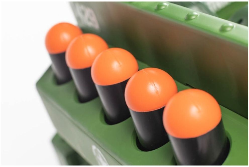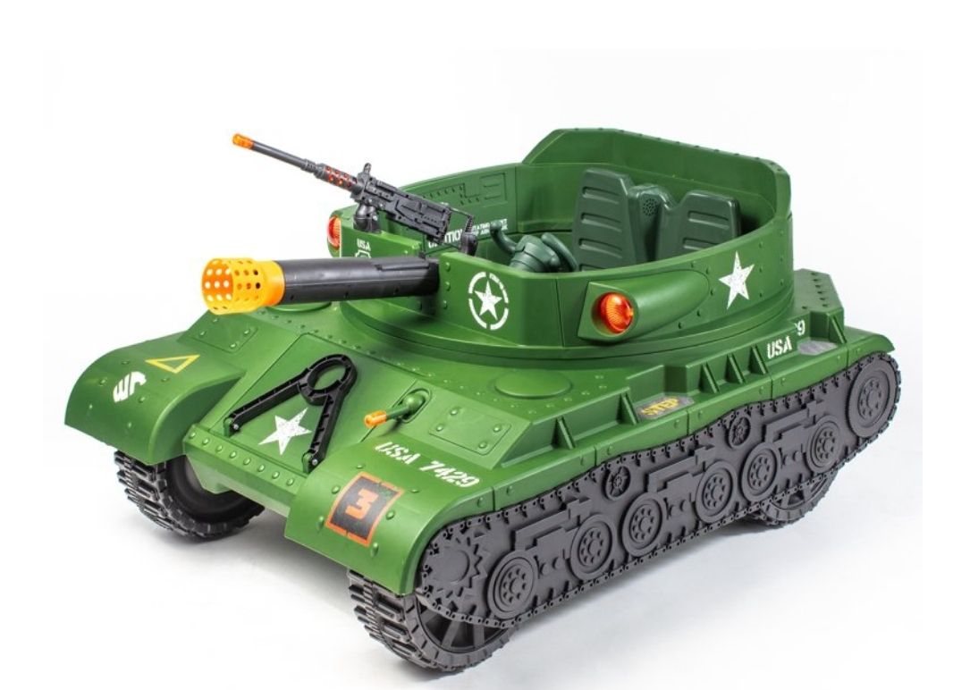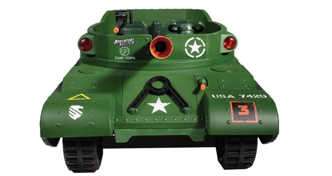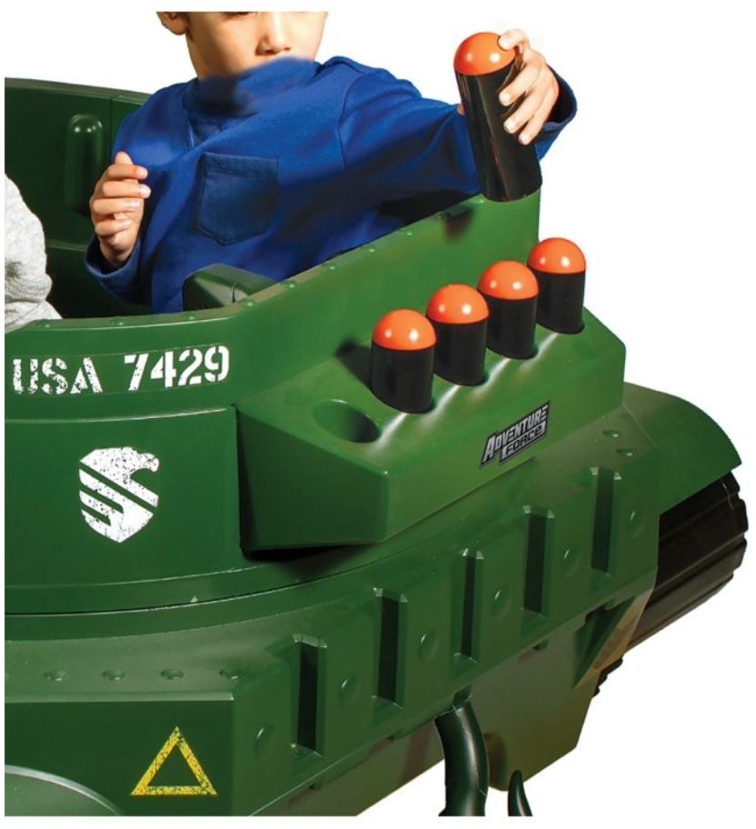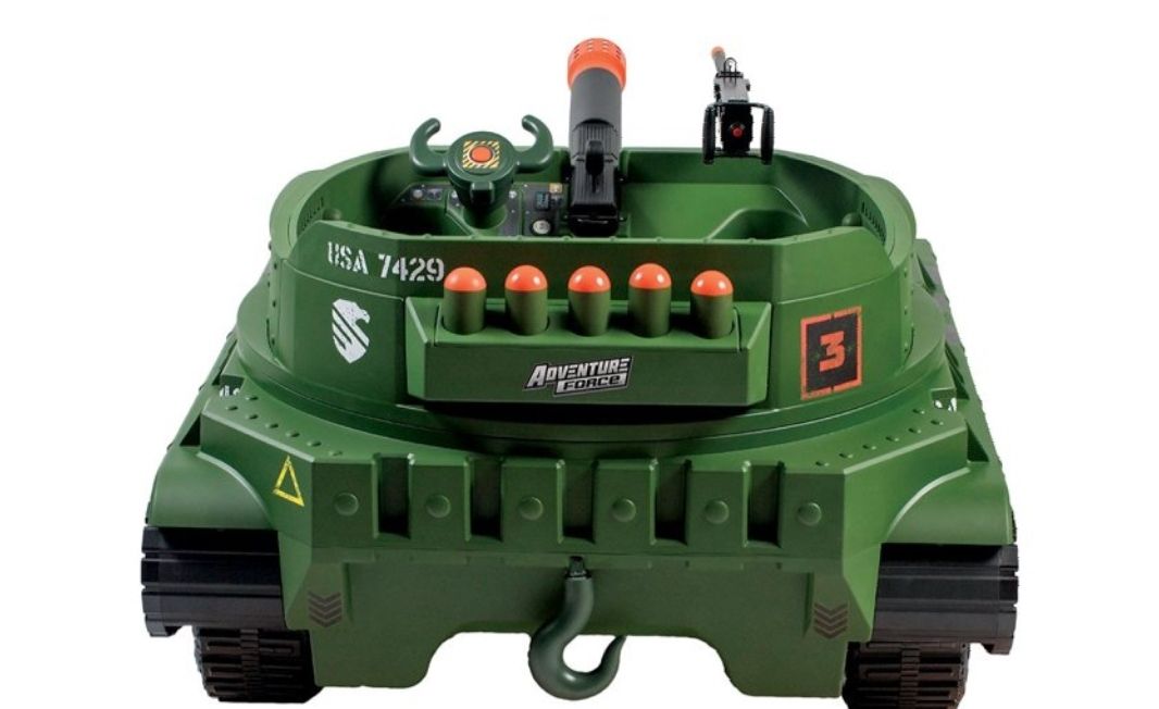 Adventure Force 24 VOLT THUNDER TANK!Feel the Thunder - Working shoots plastic shells as you feel the \"boom\" of thunder from speakers in the seat!Swivel Blaster - Your passenger can man the multi-directional swivel blaster. Press the thumb button to unleash the lights and sounds - watch out for crossfire!Rotating Turret - Manually spin the rotating turret to aim the c at your desired target. Ammo at your fingertips - 5 shells are ready for action stored right behind you. Load the cann - Lift the loading door, pull back the lever, grab a shell, load the c and release when on target! Boom!!Lights and Sounds - Large red battle lights shine as you roll into battle. Authentic startup sound, c boom, and blaster fire. Cross fire also erupts during battle! Rumble Tread - Unique tire tread provides tank like driving sounds!Authentic Design - Military decals, front tow hook and rear tow hook all help your