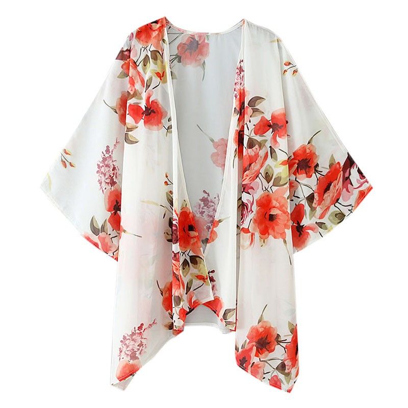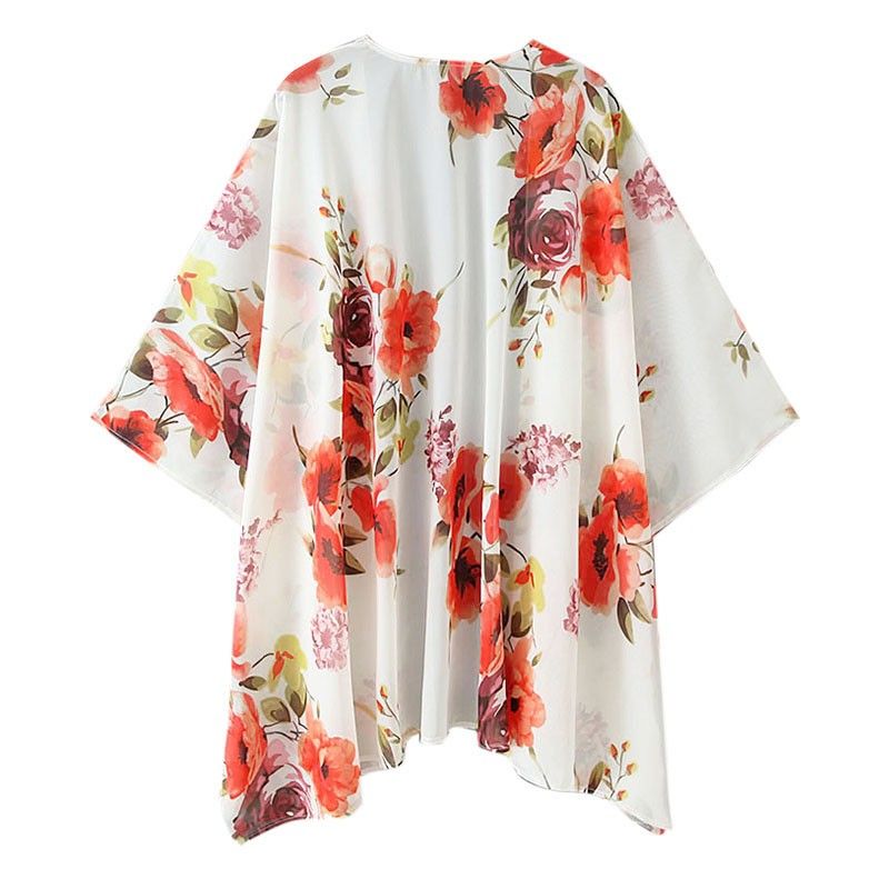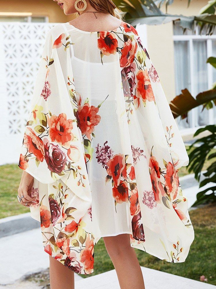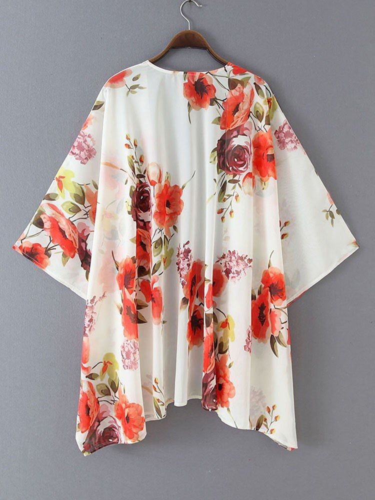 This loose kimono cover-up, made from soft chiffon, features a floral print all-over, open front and 3/4 sleeves, which makes you snug and fashionable. Come and try it.