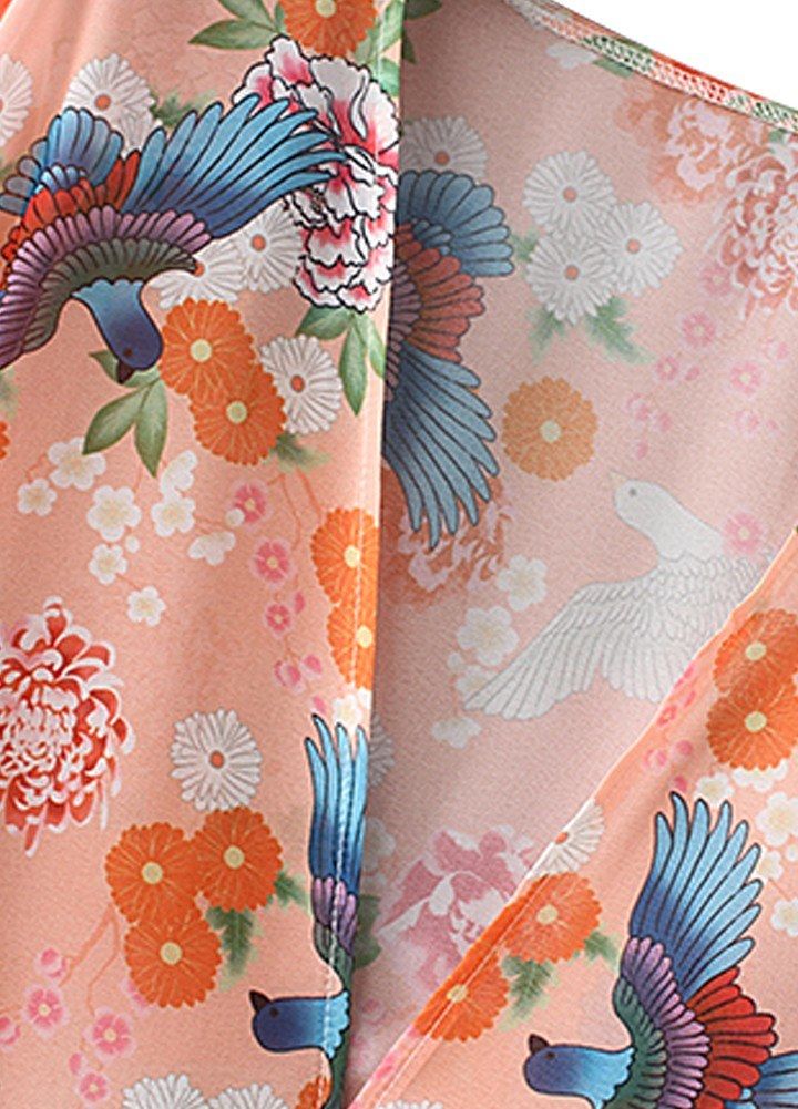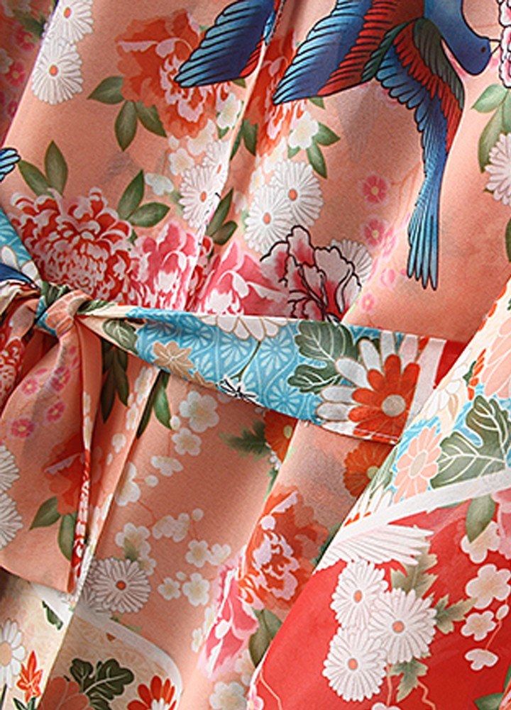 This maxi kimono-style cardigan features colorful floral print all over, dropped shoulder with batwing long sleeves, open placket and a matching waist strap. Finished with silky chiffon fabric and a comfy loose fit.