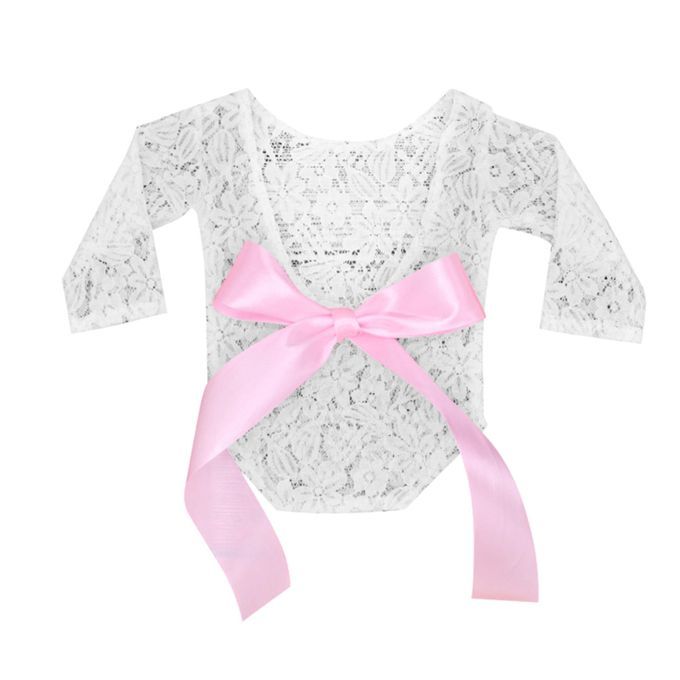 Fashionable Design: Solid color, Long sleeve lace romper for newborn baby girls photography props. V-cut open-back design with ribbon bow and long sleeves makes it very cute and fashionable.
