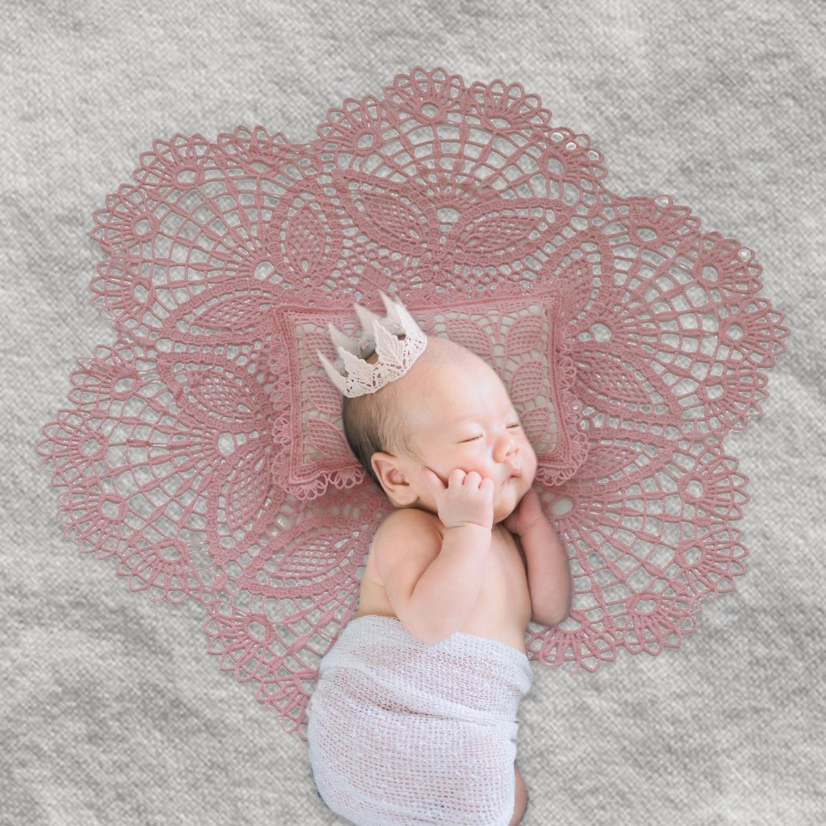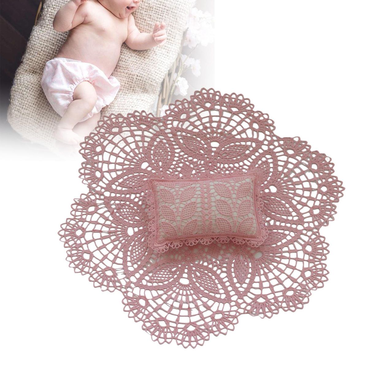 Baby Photography Prop: Comfortable baby photography props filler background mat and pillow set.Reliable Quality: This photo floor mat and pillow are made of high quality polyester fiber material, soft and skin friendly and comfortable for baby to use.Elegant Design: Handmade sewing hollow out lace trim, very beautiful, not only as photo filler mat, but also as background rug.Suitanle for: perfect for baby, boys and girls, birthdays, parties, photos, bath gifts, etc.Easy to Care: This baby photography floor mat is easy to wash (hand wash and air dry please), and quick to dry, durable for long last use.