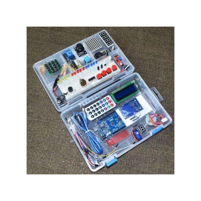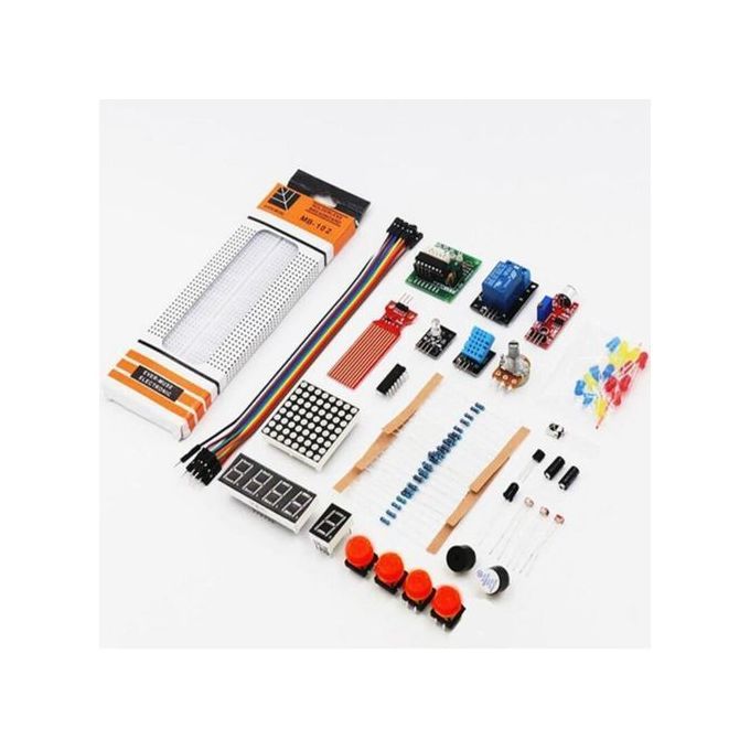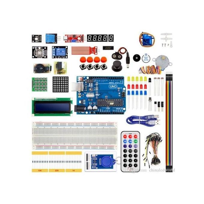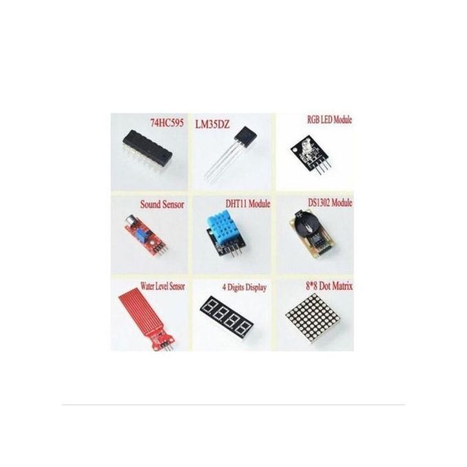 Package Contents:1 x Board1 x USB Cable1 x Jump Cable1 x Breadboard5 x LED Light1 Pack Resistor1 x Female to Male Dupond Line1 x Potentiometer1 x Buzzer1 x 74HC5951 x Infrared Receiver1 x LM351 x Flame Sensor1 x Ball Switch1 x Photoresistor1 x Key Button1 x Remote Control1 x 4-Digit Display Tube1 x 8*8 Dot Matrix Module1 x 1-digit Display Tube1 x Stepper Motor Driver Board1 x Stepper Motor1 x 9g Servo1 x IIC 1602 LCD1 x XY Joystick Module1 x Temperature Module1 x Water Test Module1 x RF Module1 x RF Keychain1 x RF White Card1 x Sound Module1 x Relay Module1 x Clock Module1 x 4*4 Key Board1 x RGB 3 Color Module1 x 9V Battery Snap