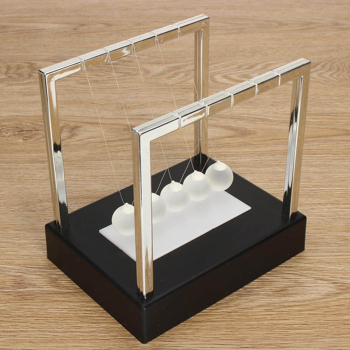 This classic desktop display piece has become a must have for office decor. Swing one steel marble back, let it go, and watch as energy causes the one on the opposite side to swing the same distance! If you're feeling saucy one day, try swinging two or three at once- just don't pass out from the excitement! This desktop display model is a version of Newton's cradle, a device that demonstrates conservation of momentum and energy via a series of identically sized swinging spheres. When one ball on the end is lifted and released, the resulting force travels through the line and pushes the last ball upward.