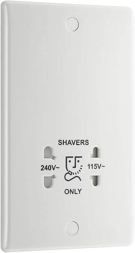This Nexus 800 series white moulded dual voltage shaver socket from British General is suitable for use with 240V and 115V shavers and electric toothbrushes. Its moulded white front-plate has a high resistance to fading discolouration and scratches, with inherent anti-microbial properties proven to reduce bacterial development and inhibit the growth of infectious diseases. Designed with captive screws for ease of installation, and finished with softly rounded edges and screw caps for a sleek appearance. The subtle design will blend with any decor - suitable for domestic or commercial installations.