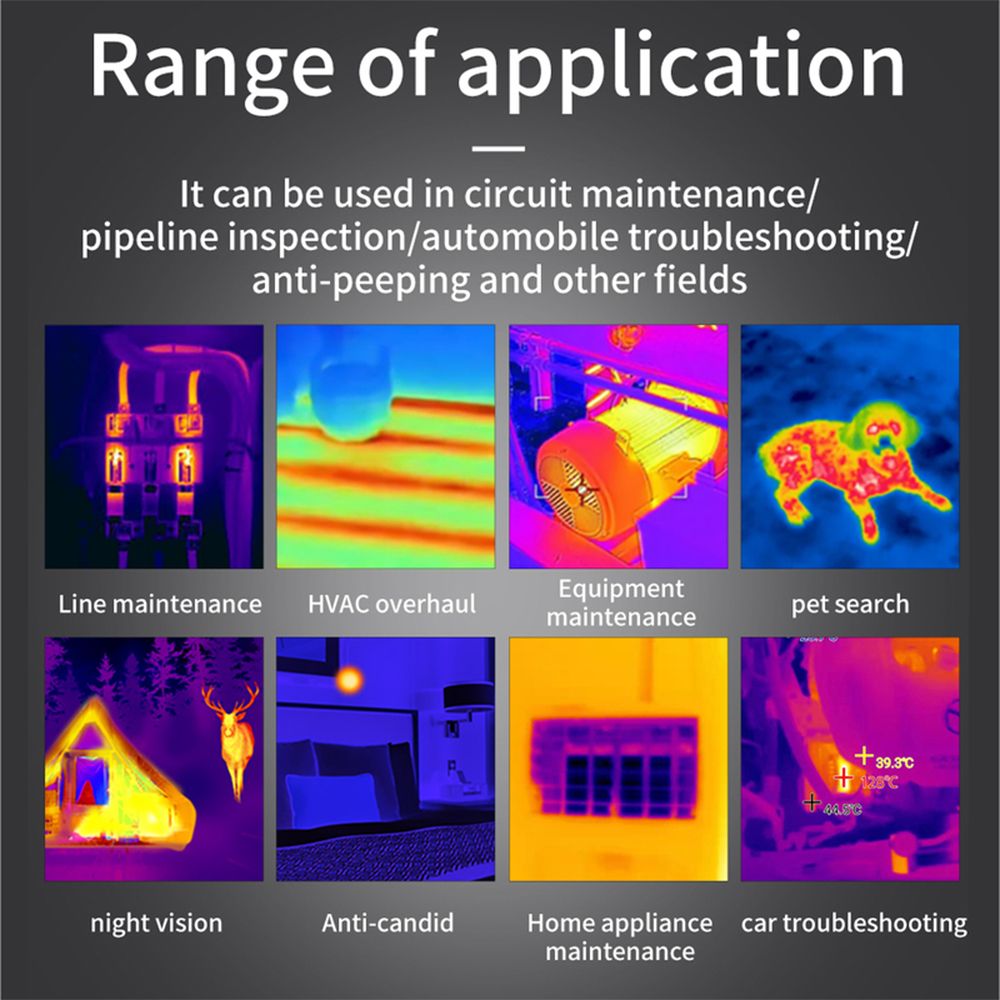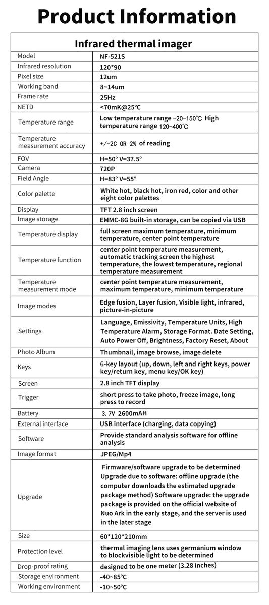 Features:Our thermal image resolution is 120*90 led display ,38°X50° Field of View, 25Hz refresh rate,2.8 TFT LCD Display, clear and smooth video recording.
