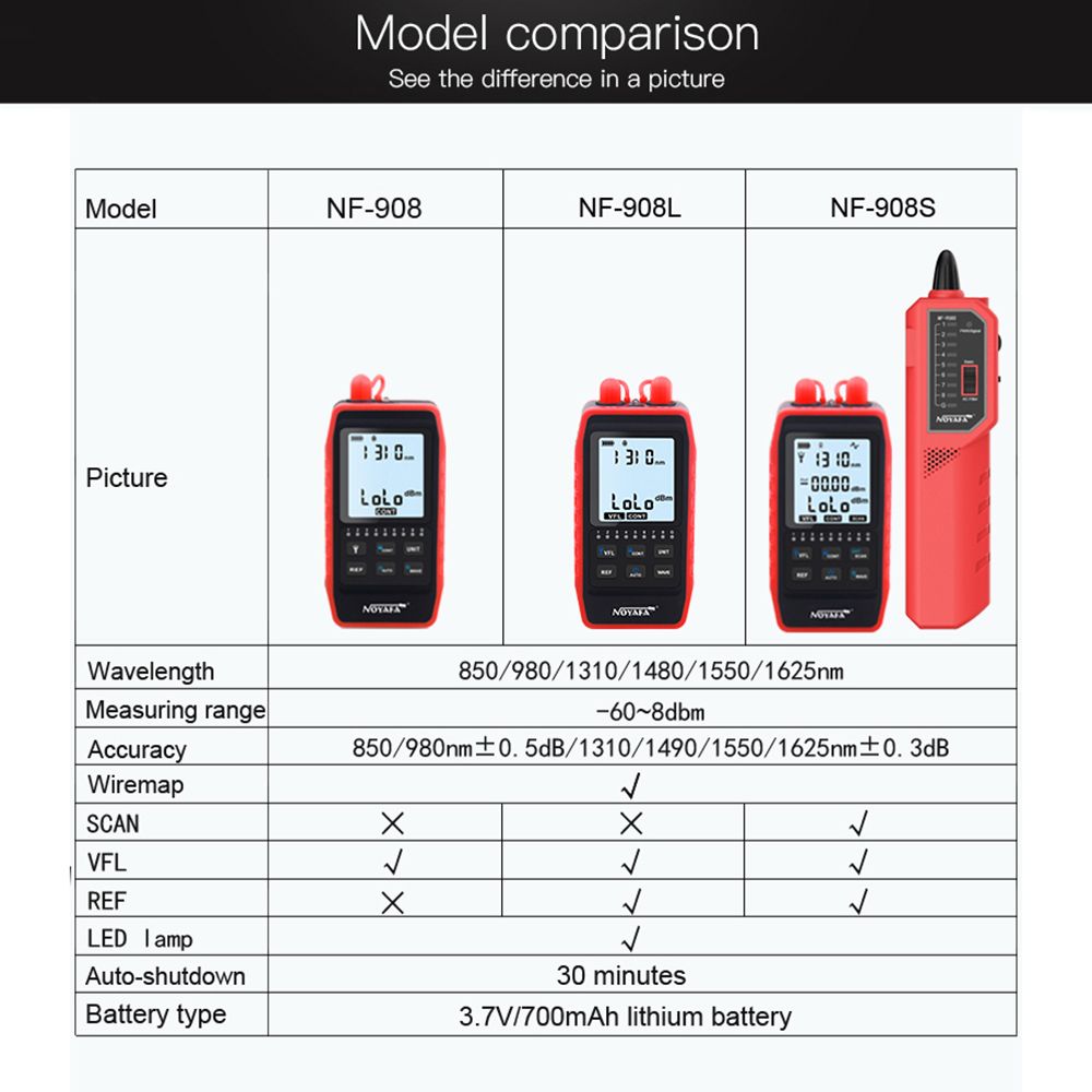 NF-908L:,1 x Optical Meter,1 x RJ45 Remote Adapter,1 x Cable,1 x Manual (English),NF-908S:,1 x Optical Meter,1 x Wire Tracker (Receiver),1 x RJ45 Remote Adapter,1 x Cable,1 x Manual (English)