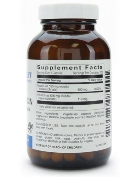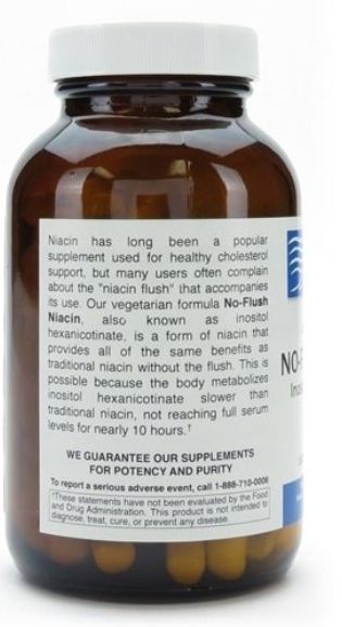 Niacin has long been a popular supplement used for healthy cholesterol support, but many users often complain about the "niacin flush" that accompanies its use. Our vegetarian formula No-Flush Niacin, also known as inositol hexanicotinate, is a form of niacin tha provides all of the same benefits as traditional niacin without the flush. This is possible because the body metabolizes inositol hexanicotinate slower than traditional niacin, not reaching full serum levels for nearly 10 hours