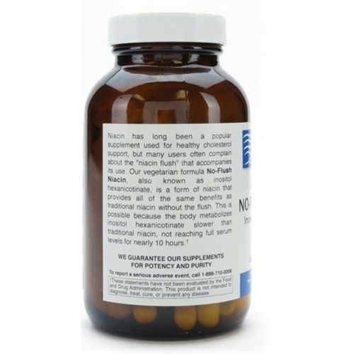 Niacin has long been a popular supplement used for healthy cholesterol support, but many users often complain about the "niacin flush" that accompanies its use. Our vegetarian formula No-Flush Niacin, also known as inositol hexanicotinate, is a form of niacin tha provides all of the same benefits as traditional niacin without the flush. This is possible because the body metabolizes inositol hexanicotinate slower than traditional niacin, not reaching full serum levels for nearly 10 hours