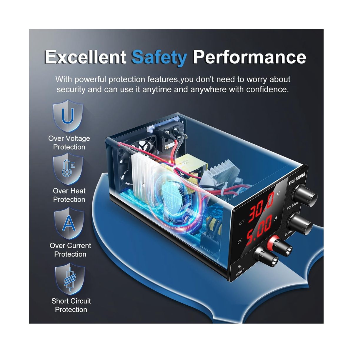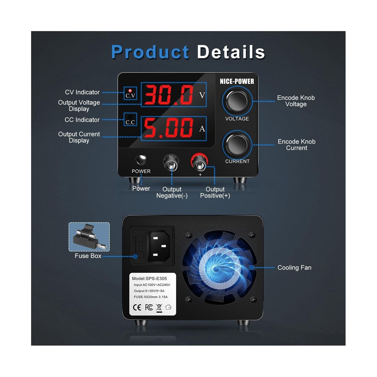 [Precise 3-digit LED Display]The NICE-POWER DC bench power supply has a resolution of 0.1V and 0.01A, and you can easily adjust it in the range of 0-30V and 0-5A. The 3-digit back-lit LED display provides more accurate and clearly visible readings for the voltage and current value, even in conditions of low voltage.