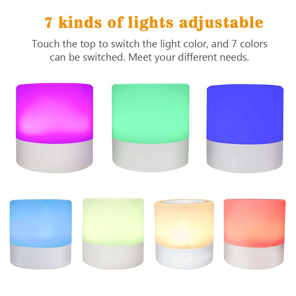 This night light has a total of 7 colors of lights. Touch the top light symbol to change between white / red / blue / green / purple / yellow / cyan / multicolor gradients in sequence. Short press the on-off key in the power-on state to adjust the three-level light brightness cyclically.