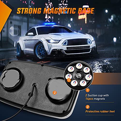 - Easy Installation: This strobe lights is plug and play and omes with 2 magneti ups with a total of 14 magnets. Just attah the magneti base on any metal exterior of ars and plug the igar .