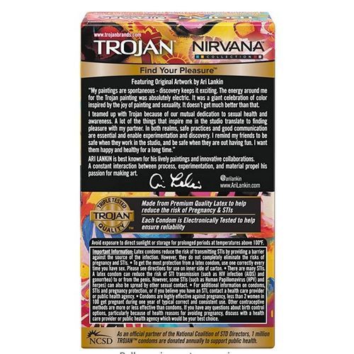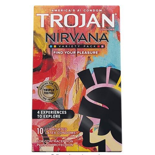 Trojan Nirvana unlocks a world of pleasure with a collection of different Trojan Condoms, offering a variety of sensations to explore and find your pleasure. The exclusive packaging design was created by renowned artist Ari Lankin and inspired by each condom?s unique sensory experience. Package includes (3) Condoms ? Real (Qty 1): Smooth pleasure with silky lubricant for those special intimate moments ? Bold (Qty 1): Stimulating textures for an unpredictable experience with deep ribs for enhanced pleasure ? Breathless (Qty 1): Long lasting lubrication for uninterrupted pleasure all night longAssortment includes REAL, BOLD, and BREATHLESS Condoms for a variety of experiences.Lubricated ? for comfort and sensitivityMade from premium quality latex to help reduce the risk of pregnancy and STIsEach condom is electronically tested to help ensure reliabilityAmerica's #1 condom trusted for over 100 years