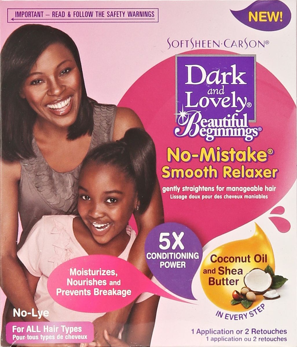 Dark and Lovely Beautiful Beginnings No-Mistake Smooth Relaxer gently straightens all hair types and nourishes your child's hair with Coconut Oil and Shea Butter for silky softness and manageability. Recommended for all hair types. • Gentle formula for children • Conditions and nourishes • For all hair types • We believe in beauty without compromise Always read all product labeling and instructions completely prior to use. READ AND FOLLOW ENCLOSED INSTRUCTION SHEET BEFORE USING. FAILURE TO FOLLOW INSTRUCTIONS OR WARNINGS OR OTHER MISUSE OF THE PRODUCT CAN CAUSE INJURY TO EYES OR SKIN AND CAN DAMAGE HAIR OR RESULT IN PERMANENT HAIR LOSS.
