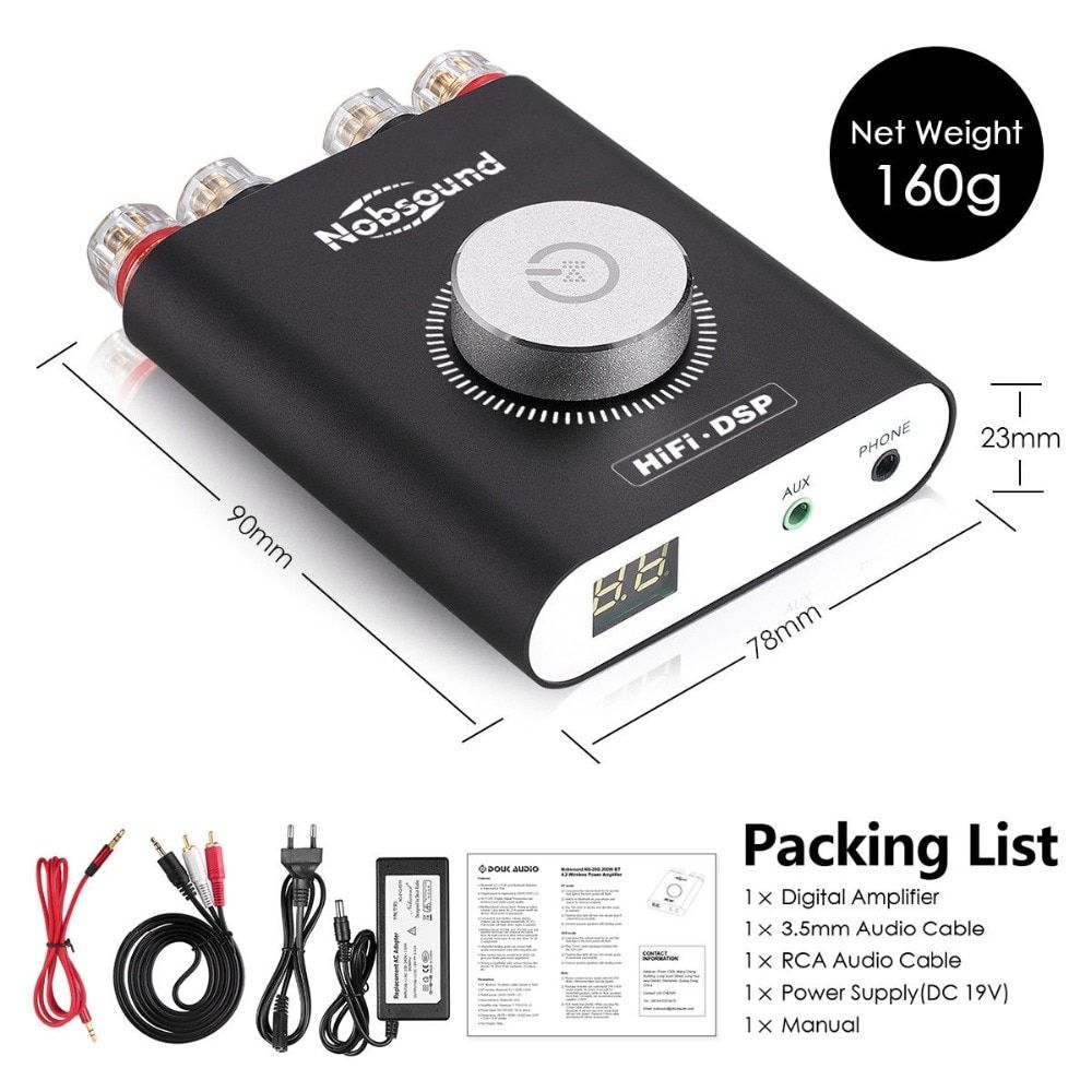 Package Weight: 300g/500g (Without/With Power Supply) Packing List 1 * NS-20G Amplifier 1 * 19V Power Supply 1 * RCA Audio Cable 1 * 3.5mm Audio Cable 1* Manual