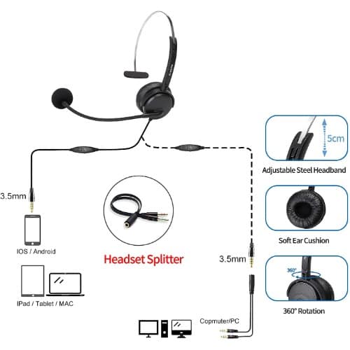 Multi-Device Headset: The perfect business headset for voice calls, Skype, webinars and more. The 7.71 ft (235cm) cable is just the right length to give you the freedom to stand up and stretch during long conversations. Stereo Sound: Enjoy clear audio for music, games and calls. A reliable headset for daily tasks including video calls with family or colleagues. Rotating Microphone: Boom can rotate 180 & deg;to be worn on the left or right. Flexible mic can be positioned for better voice capture and background noise reduction. Boom can be tucked out of the way when you & rsquo;re not using it. Adjustable Headband: Sturdy yet lightweight stereo headset has a broad range of adjustment. Ultra-soft foam ear cushions provide hours of comfort. 3.5mm Audio Jack Connection: Simply plug the 3.5mm jack into your computer, smartphone or tablet and you & rsquo;re ready to talk.