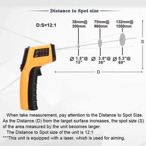 Specifications:• Measuring range: -50 ° C ~ 380 ° C (-58 ° F ~ 716 ° F)• Accuracy: -50 ° C ~ 0 ° C (± 3 ° C), 0 ° C ~ 380 ° C (± 1.5%)• Repeatability: 1 ° C or 1% of reading• Resolution: 0.1 ° C or 0.1 ° F• Response time: 500mSec, 95% response• Emissivity: 0.95 preset• Distance to the Point Ration: 12: 1• Spectric response: 8 ~ 14rm• Storage temperature: -20 ° C ~ 60 ° C (-4 ° F ~ 140 ° F)• Operating temperature: 0 ° C ~ 40 ° C (32 ° F ~ 104 ° F)• Operating humidity: 10-95% RH non-condensing, up to 30 ° C (86 ° F)• 2 AAA 1.5V batteries (not included)