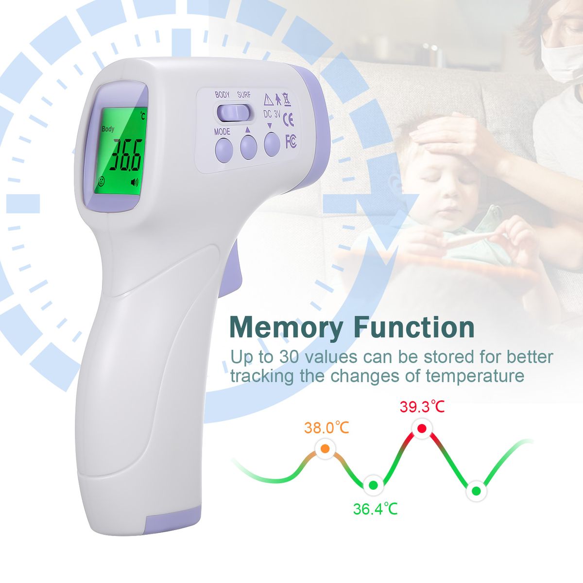 Precisely measure the temperature of body, water, milk and room. The body temperature measurement range is 32~42.9℃ and that of surface is 0~100℃.