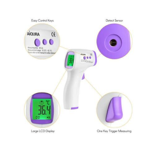 The AiQura infrared forehead thermometer is a type of non-contact thermometer that uses infrared technology to measure the body temperature by scanning the forehead. It is designed to provide fast and accurate temperature readings without any physical contact with the skin, which makes it a convenient and hygienic way to monitor body temperature.The thermometer is equipped with an LCD screen that displays the temperature reading in both Celsius and Fahrenheit units. It has a measuring range of 32°C to 42.5°C (89.6°F to 108.5°F) and can deliver results within one second. The thermometer also has a fever alarm feature that alerts the user if the measured temperature is above the normal range.To use the AiQura infrared forehead thermometer, the user needs to point the device towards the forehead from a distance of 3-5 cm and press the button to take the measurement. The thermometer will then display the temperature reading on the LCD screen. The device is powered by two AAA batteries and is lightweight and portable, making it easy to use at home, in clinics, or while traveling.It is important to note that the AiQura infrared forehead thermometer is designed for screening purposes and is not a substitute for professional medical advice. In case of any health concerns, it is recommended to consult a healthcare provider.