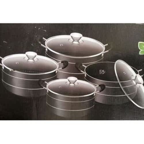 This Stainless Steel 6-Piece Cookware Set features a 9'' casserole pot with lid, 8'' casserole pot with lid, 7'' casserole pot with lid, 6'' casserole pot with lid, 6'' . This cookware set is suitable for all cooking surfaces. As it is made using stainless steel, this cookware set stays strong for years to come. The Stainless Steel 6-Piece Cookware Set has a thermal diffused base for fast heating. The handles are isolated from heat and offer a comfortable grip. The highly resistant glass lids with steam vents keep the moisture locked in and help cook flavorful meals.