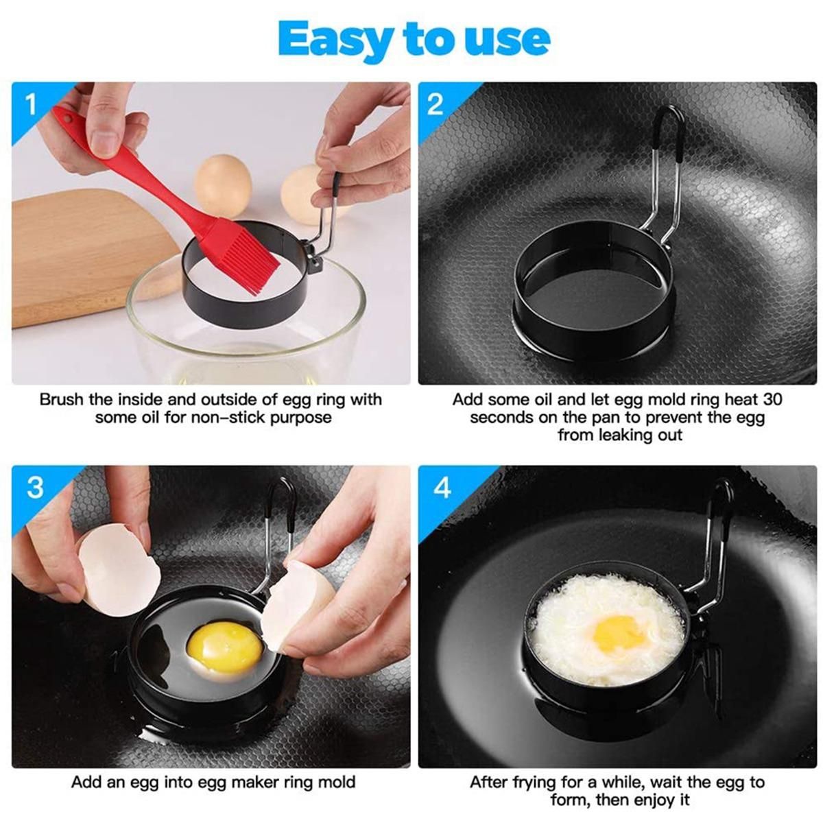 Tips of Using Egg Cooking Rings: 1,Brush the inside and outside of egg ring with some oil for non-stick purpose. 2, Add some oil and let egg mold ring heat 30 seconds on the pan to prevent the egg from leaking out.3,Add an egg into egg maker ring mold.4,After frying for a while, wait the egg to form, then enjoy it.