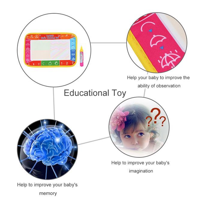1 x Water Drawing Mat 1 x Magic Pen(without cover) Note: This product must be used under adult supervision. Plastic bags can be dangerous. To avoid danger of suffocation, keep this bag away from babies and children.