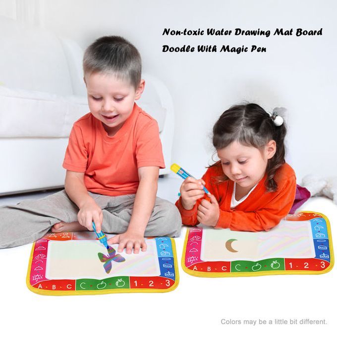 The little coloring pen just fills up with water which can't hurt baby and then they draw a picture on the mat that has color variations throughout.Simple to use, you only need to fill the pen with water, and the drawings will magically disappear in few minutes ready to doodle again.It only creates colors on the drawing mat. Anyplace else, it does nothing obviously.The mat will be perfect to take on airplanes, car rides and anywhere.Specifications:Material: ClothColor: As the picture showGender: UnisexAge: Older than 3Package Size: 25 x 18.5 x 2 cm / 10 x 7 x 0.8 inPackage Weight: 24 g / 0.8 ozPackage List:1 x Water Drawing Mat1 x Magic Pen(without cover)Note: This product must be used under adult supervision.Plastic bags can be dangerous. To avoid danger of suffocation, keep this bag away from babies and children.