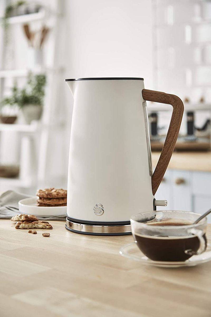 The transparent measuring gauge on the side allows you to see exactly how much water you are putting in, for energy efficient boiling. The slick sophistication of Nordic design combines style and functionality to make the perfect modern kettle for the minimalist kitchen. Its sleek stainless-steel, matte finish body in a beautiful cotton White colour and wood effect handle are simple yet stylish and will make a lovely addition to anyone's kitchen. Ideal for domestic kitchens both small and large, Hotel rooms, guest houses, offices and staff rooms.