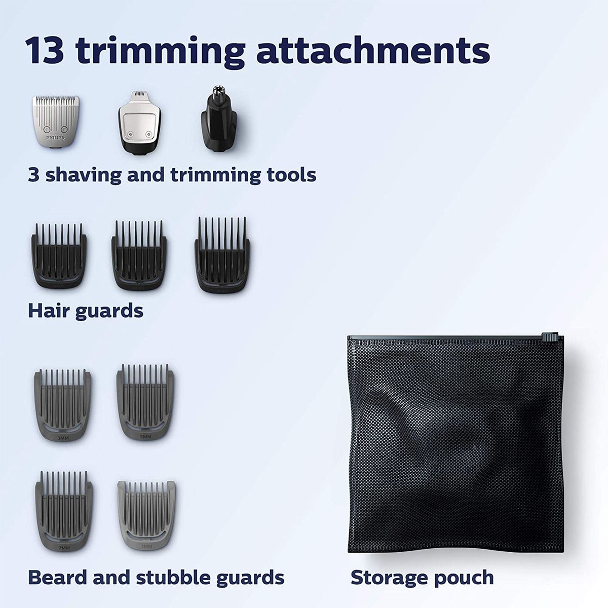 13 attachments for all of your grooming needs: Full size steel trimmer, a steel precision trimmer, a nose and ear hair trimmer, 3 hair trimming guards, 3 beard trimming guards, a stubble guard, an accessory travel storage bag, and a cleaning brush. Unlike competition, no oil needed to maintain high quality performance Blades and Guards are easy to detach and rinse.Maximum precision with DualCut technology, which includes 2x more self-sharpening blades. The steel blades sharpen themselves as they work, resulting in blades that remain as sharp as day 1 after 2 years of use.Best selling trimmer from the #1 trimmer brand*.Unlike competition, no oil needed to maintain high quality performance.Blades and Guards are easy to detach and rinse, For Hair Type: All Hair Types.The Blade is made out of Metal