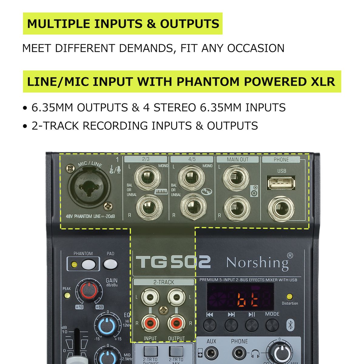 Inputs amp; Outputs: Line/Mic input with phantom powered XLR, 4 stereo 6.35mm inputs; 6.35mm outputs; 2-Track recording inputs amp; outputs(lotus jack), outputs assignable to mix or headphone.