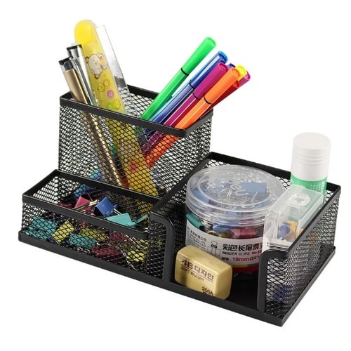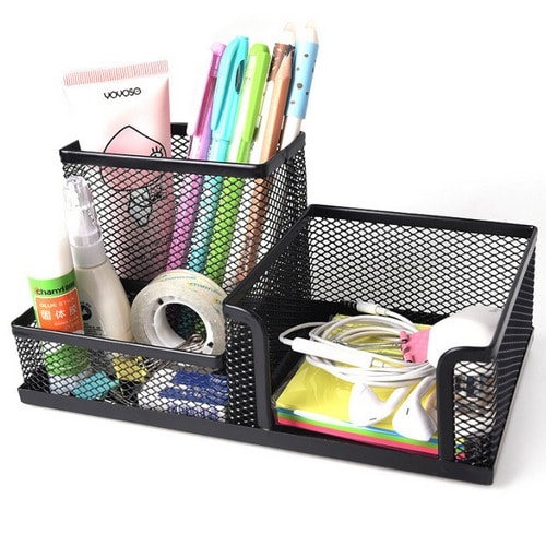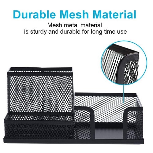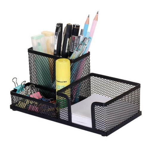 Office desktop caddy organizer, great for keeping your desktop neat and tidy.Made of durable scratch-resistant steel wire mesh with a reinforced metal rim.Features 3 compartments: Pen holder, memo holder, other stationeries compartmentA sleek versatile look with a black epoxy finish fits any office decor. The stationary in the picture is not included