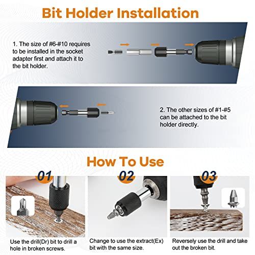 - Easy Operation: Two simple steps to remove all stuk srews or bolts in a few seonds. Step One to hoose a drill bit smaller than the damaged srew, Step Two to use the same size extrator to take out reversely use your eletri hand drills.