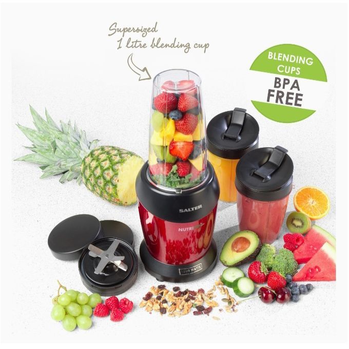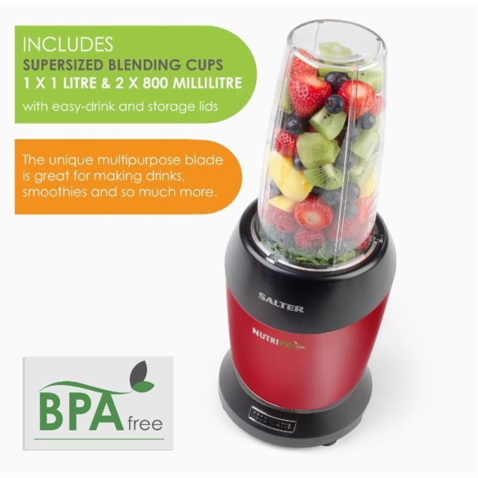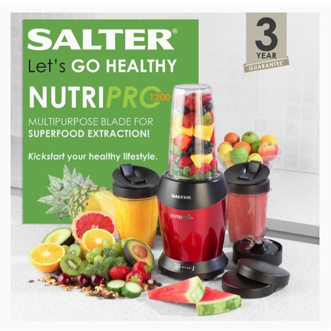 Using 1200W power and unique extraction blades, this 2nd generation Salter NutriPro blender locks in the best vitamins and minerals so you and your family can enjoy flavour packed drinks with all the nutrients you need. It comes with a large 1 litre cup, two 800 ml cups with flip top lids for drinking on the go and storage lids for preparing smoothies in advance. With a smart red base measuring just 15 x 15 x 21 cm for convenient storage. If you want to live a healthy lifestyle and pack more fruit and vegetables into your diet, the Salter NutriPro is a great way to start. This 1200W blender boasts a multipurpose blade to effortlessly chop, crush and extract the vitamins and nutrients from superfoods. The NutriPro is perfect for preparing fresh ingredients to make sauces, soups and more. Environmentally conscious, the instruction manual and tasty recipes can be found . Using 1200W power and unique extraction blades, this 2nd generation Salter NutriPro blender locks in the best vitamins and minerals so you and your family can enjoy flavour packed drinks with all the nutrients you need. It comes with a large 1 litre cup, two 800 ml cups with flip top lids for drinking on the go and storage lids for preparing smoothies in advance. With a smart red base measuring just 15 x 15 x 21 cm for convenient storage. If you want to live a healthy lifestyle and pack more fruit and vegetables into your diet, the Salter NutriPro is a great way to start. This 1200W blender boasts a multipurpose blade to effortlessly chop, crush and extract the vitamins and nutrients from superfoods. The NutriPro is perfect for preparing fresh ingredients to make sauces, soups and more. Environmentally conscious, the instruction manual and tasty