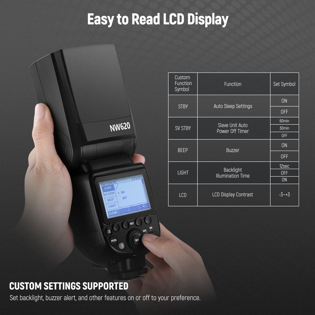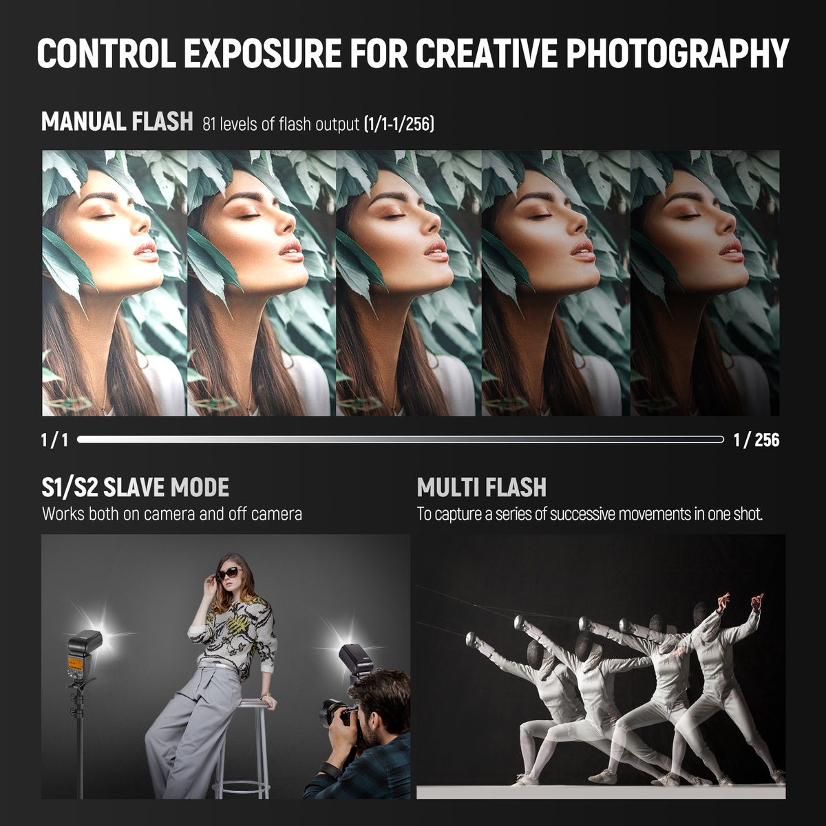 【Free Speedlite Flash Control】Supports manual(M) and multi flash as well as S1/S2 optical control. In M mode, easily adjust flash output from 1/1 to 1/256 in the 0.1 increment. In Multi mode, NW620 fires several flashes within short time to capture several phases of movement on same photo (100 flash times and 199Hz flash frequency maximum). Or realize group light control by setting NW620 in S1/S2 mode