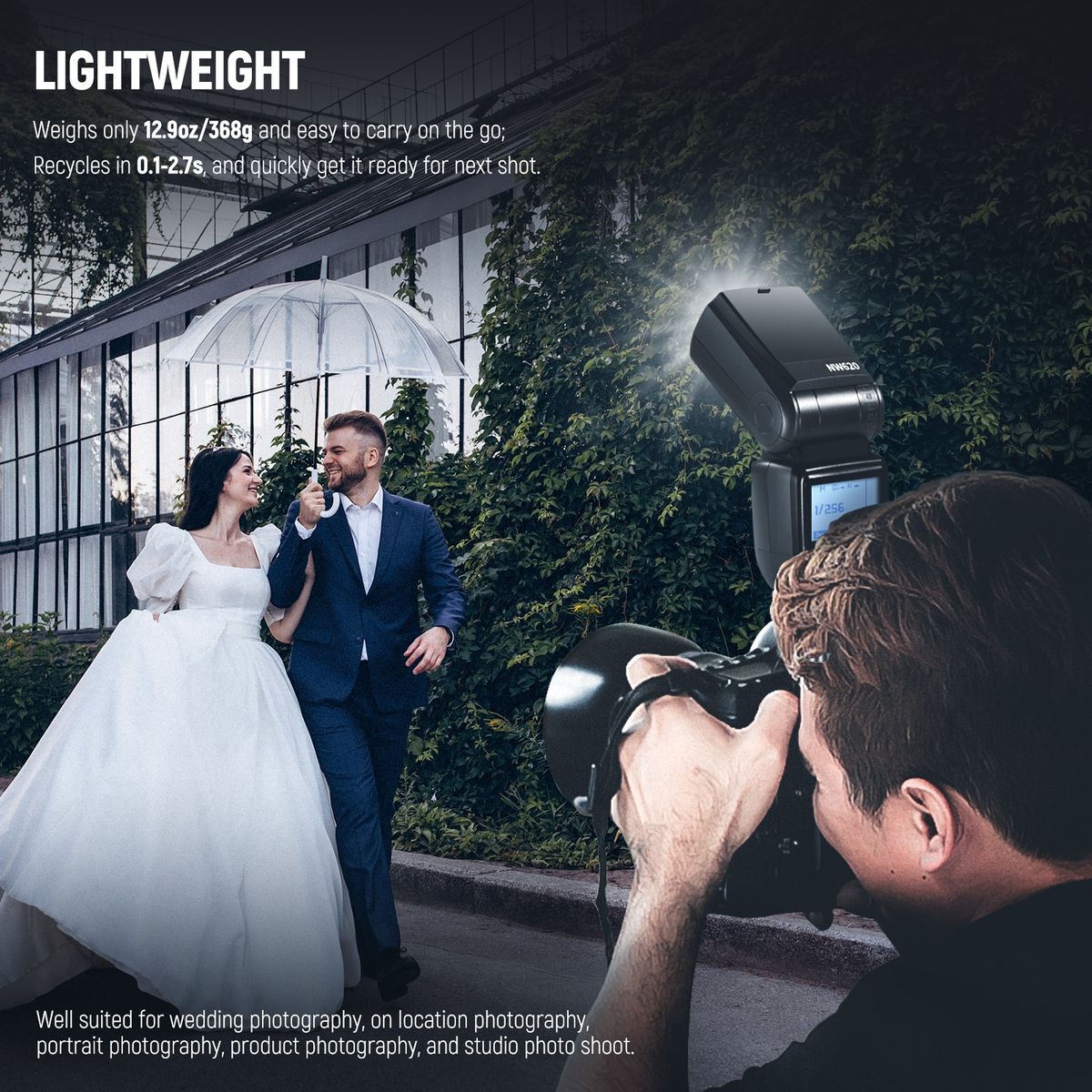 【High Performance with Dual Power Supply】NW620 receives power from 4 pieces of AA MH Ni batteries, or connect it to an external power source via CP-E4 port to speed up recycling time. With strong and flexible power supply, it supports 100-1500 times power flashes, approximately 0.1-2.7s fast recycling, and 1/300-1/20000s flash duration (when powered by 2500mA MH Ni battery) to allow photographers to never miss a shot