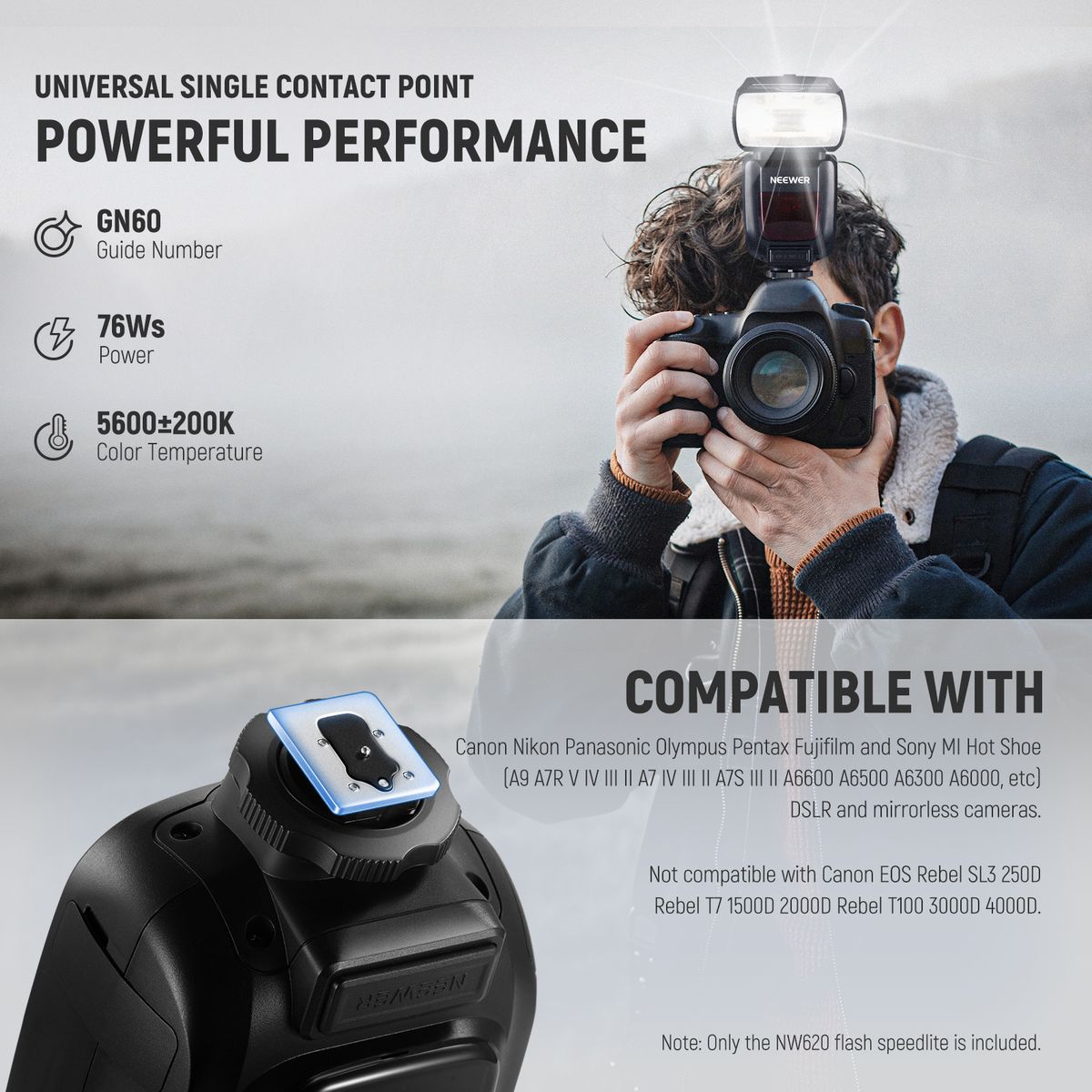NW620 universal on camera flash is compatible with Canon, Sony, Nikon, Olympus, Fujifilm, and other DSLR cameras with standard hot shoe (not compatible with EOS Rebel SL3/250D Rebel T7/1500D 2000D Rebel T100/3000D 4000D). Features GN60 high guide number, the flash provides powerful illumination and stable output.
